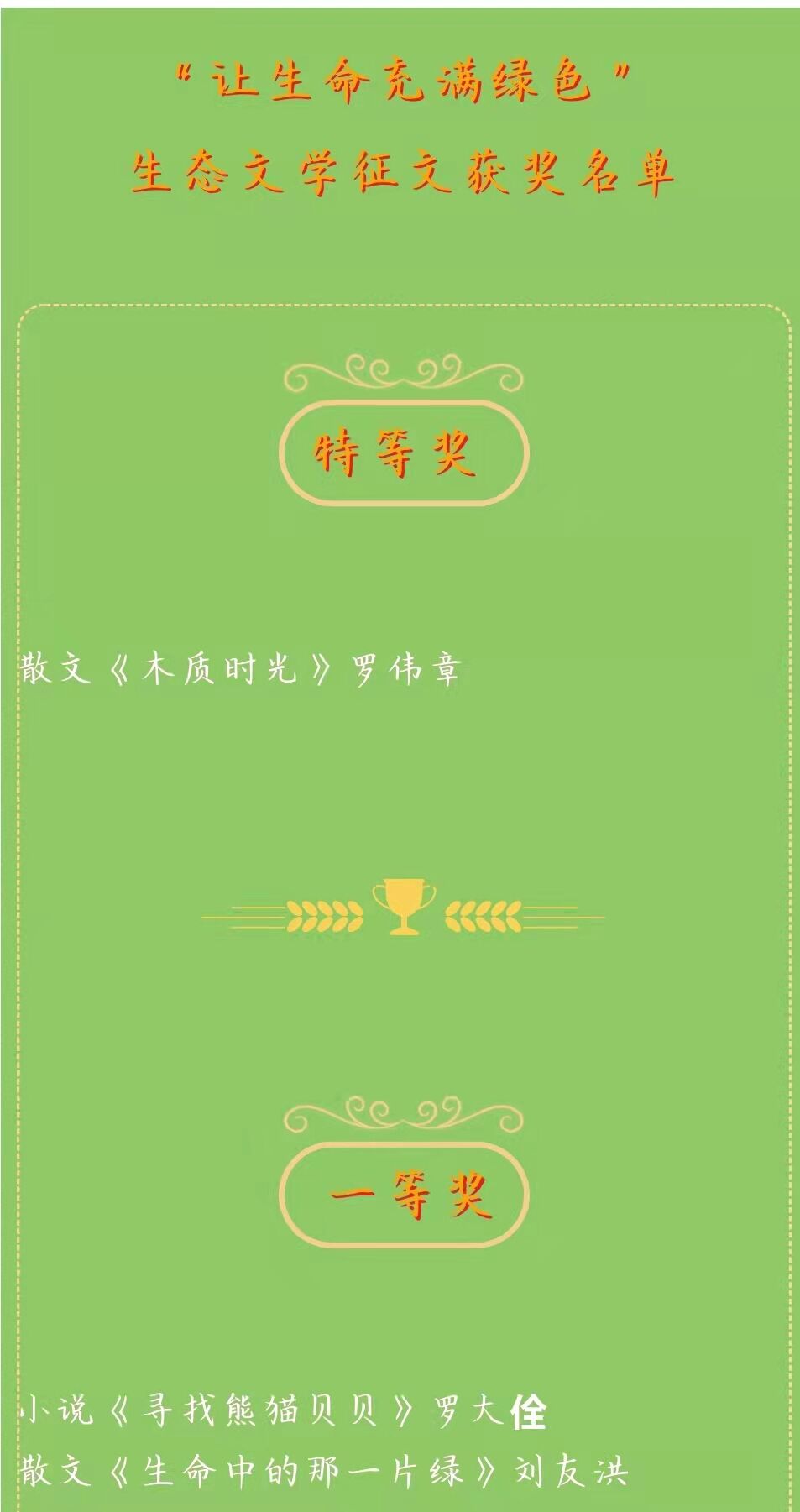 近日,由中国林业文联主办、《生态文化》杂志社承办的“让生命充满绿色”全国生态文学征文获奖名单颁布,中国作家协会会员、学院机关后勤党总支第三支部书记罗大佺的短篇小说《寻找熊猫贝贝》荣获一等奖。